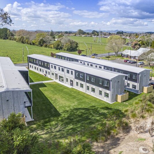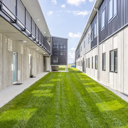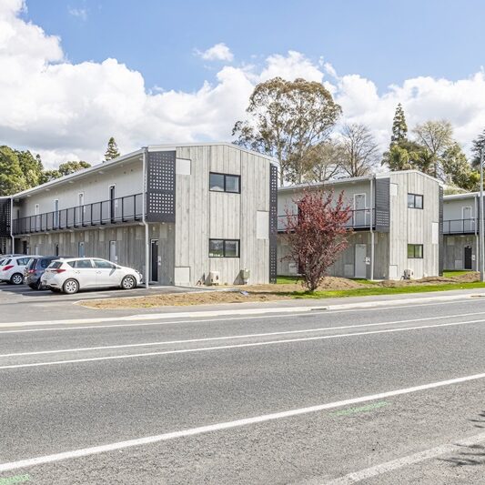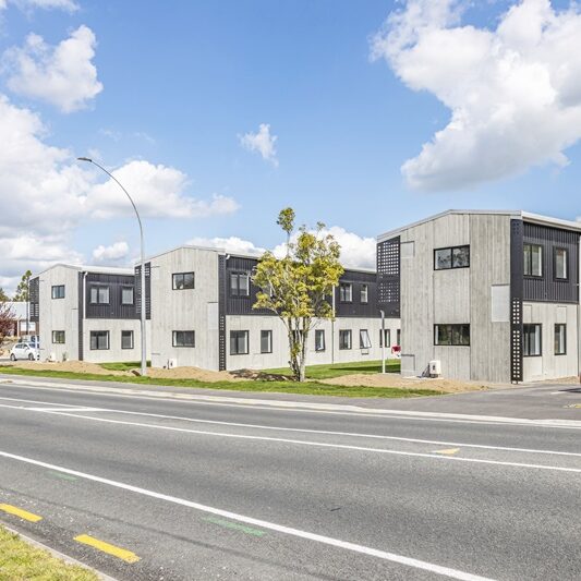 We were awarded the Silverdale Road Apartments project at the University of Waikato’s Hamilton campus on a design & build basis. The University’s brief was clear – they had a limited budget and wanted easily-maintained, self-contained accommodation with excellent acoustic performance, but also to retain some outdoor space on the compact site.