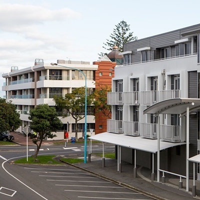 The building wrap is off Naylor Love’s two adjacent leaky building remediation projects in Mt Maunganui, revealing the rejuvenated Salisbury Crown Apartments and Anchorage Apartments.