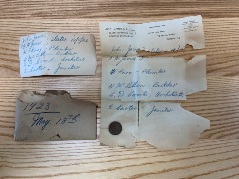 We made some fascinating discoveries along the way, including a letter written 98 years ago. Dated May 18, 1923, the letter was signed by a builder, plumber, architect, janitor, and two slaters who worked on the archway. The letter also included a half penny coin dating from 1914.