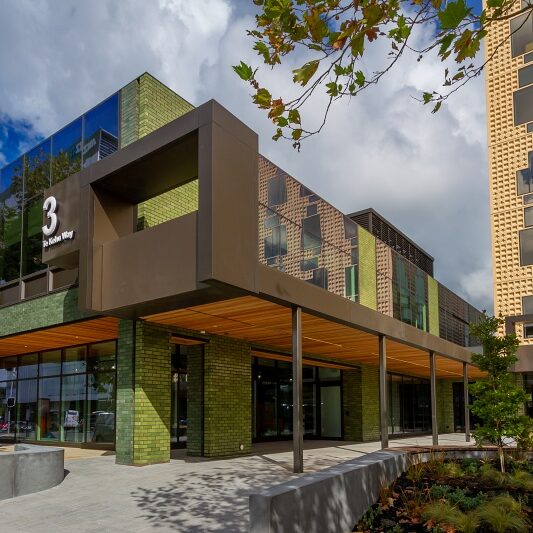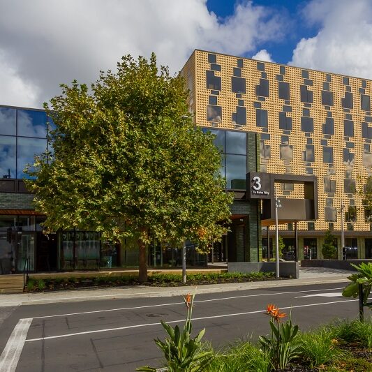 3 Te Kehu Way is a new office six-storey building in Sylvia Park. A steel-framed structure with suspended concrete floors, it features a distinctive waffle patterned concrete panel and brick façade.