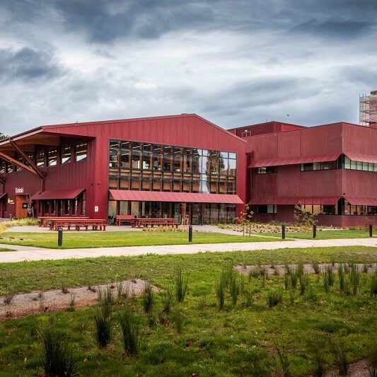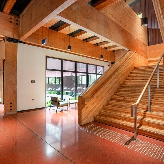Clad in red corrugated iron to reference a woolshed, the open-plan office wing is a high-tech engineered timber structure with a regular grid of LVL columns and beams, paired with a prefabricated timber cassette floor system and glulam roof members. The laboratory wing is a more traditional precast concrete structure to meet the stringent compliance requirements for PC2 accreditation.