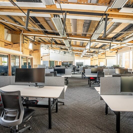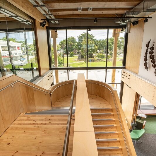 Sitting on screw pile and ground beam foundations, the superstructure is engineered timber reinforced with post-tensioned steel cables and brackets, all designed to rock in an earthquake and settle back into place. The building envelope consists of glazed curtain wall, glass fibre reinforced concrete slats, metal wall and roof cladding, and a warm roof.