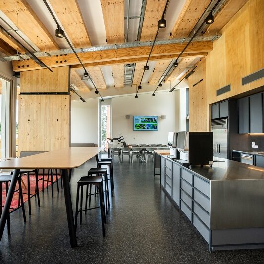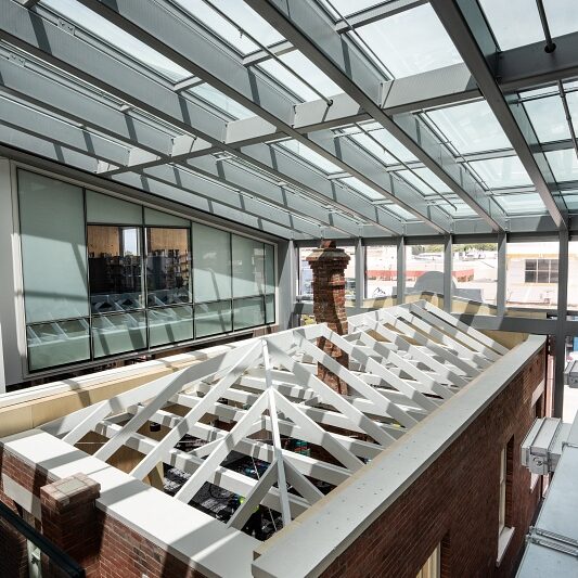 The key to integrating the multiple elements of this complex building was a BIM model combining eight separate models into one. We used this federated model to coordinate the timber and steel in the superstructure, hosting meetings with the suppliers, consultants and subcontractors to ensure that everyone was on the same page. Integrating services into the model allowed for final clash detection before the componentry was manufactured, ensuring that the services worked harmoniously with the structure with a minimum of structural penetrations.
