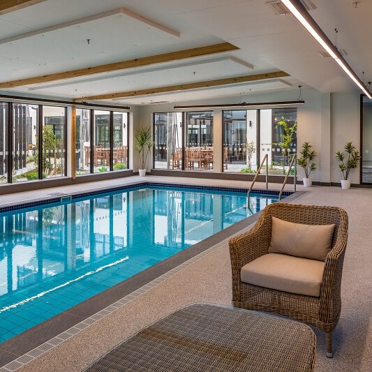 Bupa Crofton Downs includes 82 apartments and a 49-bed care home wing, plus a community centre with various lounges and cafés, a cinema, hair salon, indoor swimming pool, gym, commercial kitchen, library, offices, reception, four lifts and 26 flights of stairs. The basement is an underground car park with 100 parks and below that, the lower basement has back of house facilities, including a plant room, staff room and laundry.