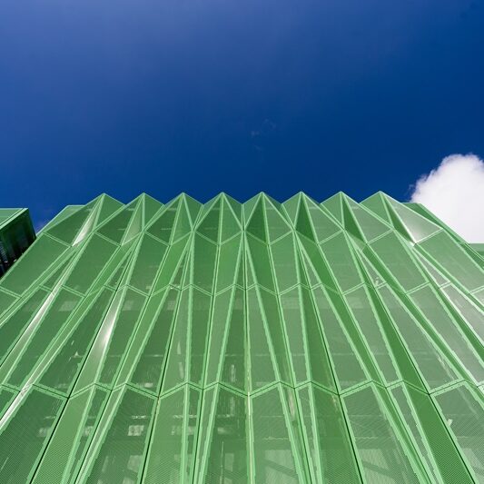 Officially known on the centre map as Car Park 2, the steel-frame and composite slab structure is clad with distinctive green perforated aluminium panels. It features rooftop rainwater harvesting, eight electric vehicle charging stations and a state-of-the-art traffic management system.