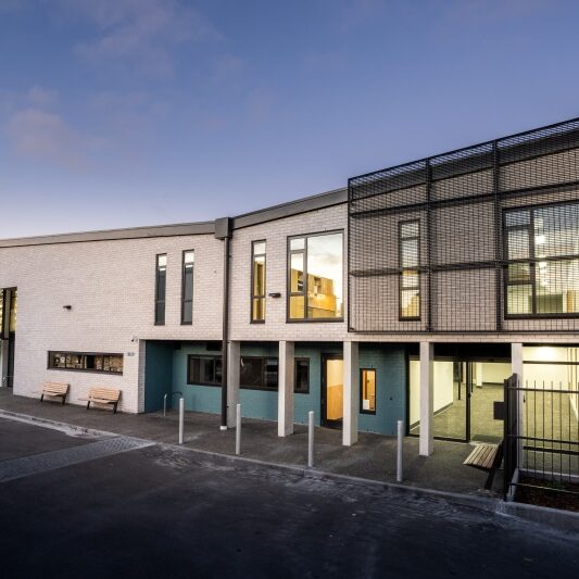 The Christchurch City Mission redevelopment is three new buildings, including a three-storey, 15-bed transitional housing facility, single storey café, and two-storey food bank, warehouse and offices. They all sit on concrete waffle pod raft slabs, with the housing building and café featuring CLT walls, floors and beams. We used more traditional precast concrete panels and steel framing in the food bank building to accommodate the expansive, open-plan layout.