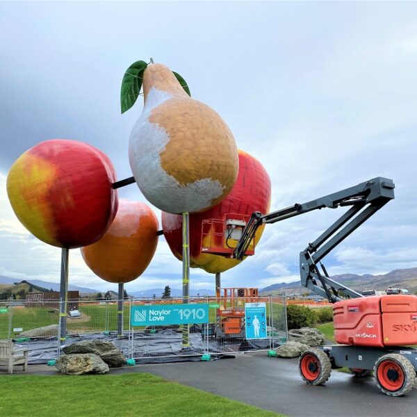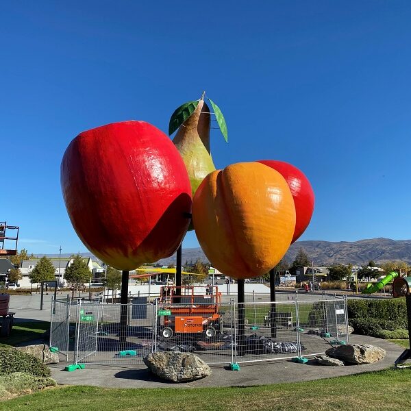 Our Central Otago Projects & Interiors team repainted the Cromwell Fruit Sculpture, a giant fibreglass apple, nectarine, pear and apricot that welcome visitors to the town.