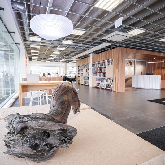 The theme for the interior was Totara, as the area was an ancient totara forest. From the full height totara berry red pivot door you walk past a natural 3000 year-old log of totara to the totara-clad board room. The landscaping was designed to resemble a regenerating forest floor.