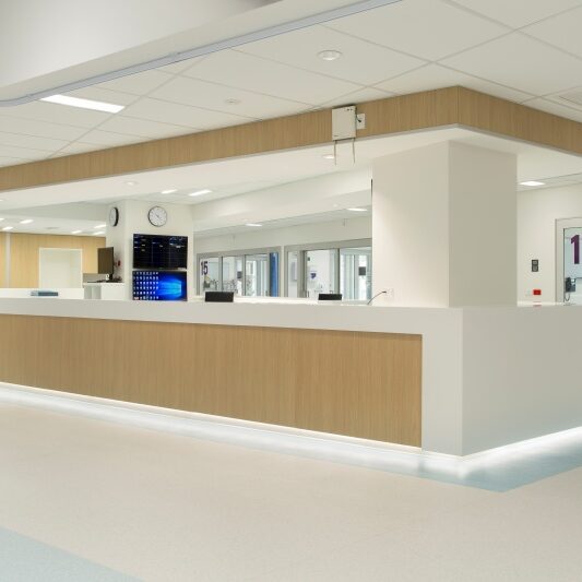 We then moved on to renovate the intensive care and high dependency units on level 5, completing the work over two stages to allow the essential service to keep operating. We started with the full demolition of the existing ward, including removal and relocation n of the services, then built and fitted out a new 22 bed ward with a negative pressure isolation room, segregation rooms, a positive pressure ventilation lobby, offices, nurses’ stations, utilities areas and drug rooms.