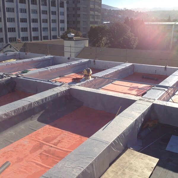 Our solution was to re-roof with a Sika Sarnifil membrane system anchored into place with a layer of stone ballast. This proved to be cost and time-effective, requiring minimal disturbance to roof-top plant. We arranged for the ballast stones to be delivered in one tonne bags that could be craned directly onto the roof and placed by untying the bag at the bottom, saving a lot of loading and unloading both at ground and roof level.