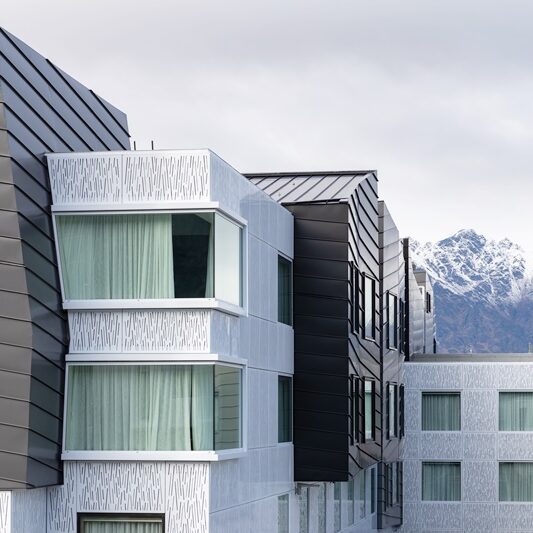 The façade aesthetic is designed to replicate the historic Queenstown glacier in the Wakatipu basin. The building is made up of a series of abstract “erratic” cantilevered boxes, protruding from the building’s main frame, and clad in the highest quality aluminium façade rain screens over two weatherproofing substrates. A combination of metal profiled Tarc Tray and mild steel panels complete the bold exterior of this prominent structure.