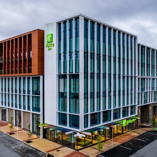 The Holiday Inn Queenstown Remarkables Park is a full service, 4-star hotel with 182 rooms, a restaurant and conference facilities. The 9,500m², five-storey plus basement building is the first ‘open lobby’ hotel in New Zealand, with a flexible, open space on the ground floor.