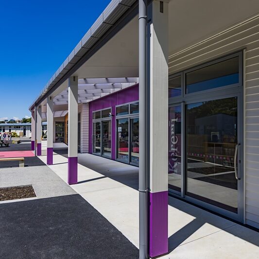 Stage 1 was the construction of a 670m2 classroom block which accommodates 250 students and 13 staff members in three large shared learning spaces, as well as multiple break out rooms, two kitchenettes, accessible bathrooms. It has easy access out into the newly constructed courtyard, which includes drinking fountains, a large timber deck and landscaped gardens.