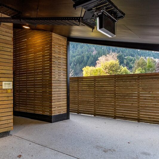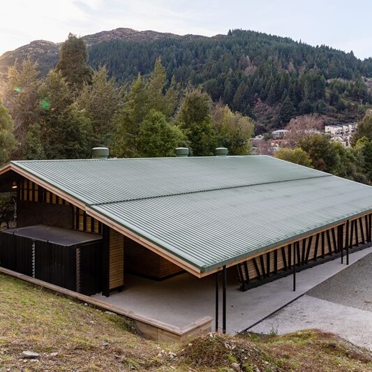 The Dunedin-based architect designed the structure with an eco-conscious focus. For example, the site was planted extensively prior to works commencing, and we used timber from trees felled on site to clad the entire building.