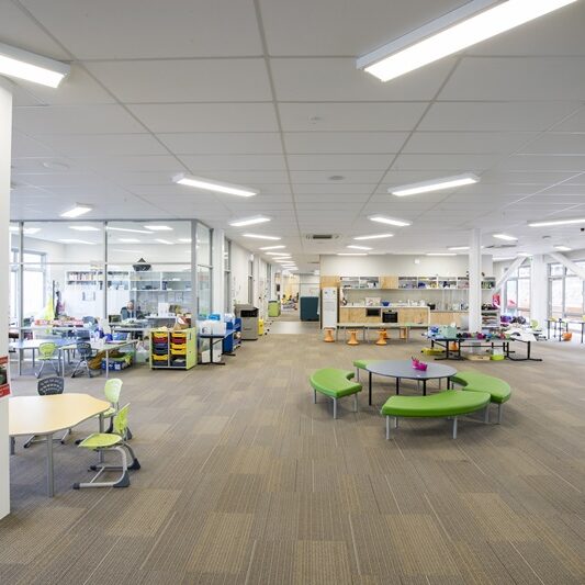 The main building includes a classroom block with modern open plan classrooms on two levels, with glass partitioned learning spaces and joinery units to cater for the school environment.