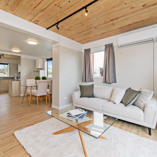 The Mahana concept promises healthy, robust, affordable and sustainable homes. These duplexes deliver with an engineered CLT mid-floor and insulated PIR roof panels, and high performance windows recessed into the insulation line. Balanced air ventilation with heat recovery keeps the homes warm and dry and running costs low. We used robust laminated wall linings and hard flooring to ensure that the homes are easy to clean, low allergen and will look good for years.