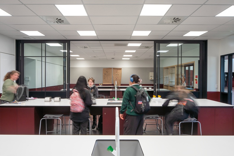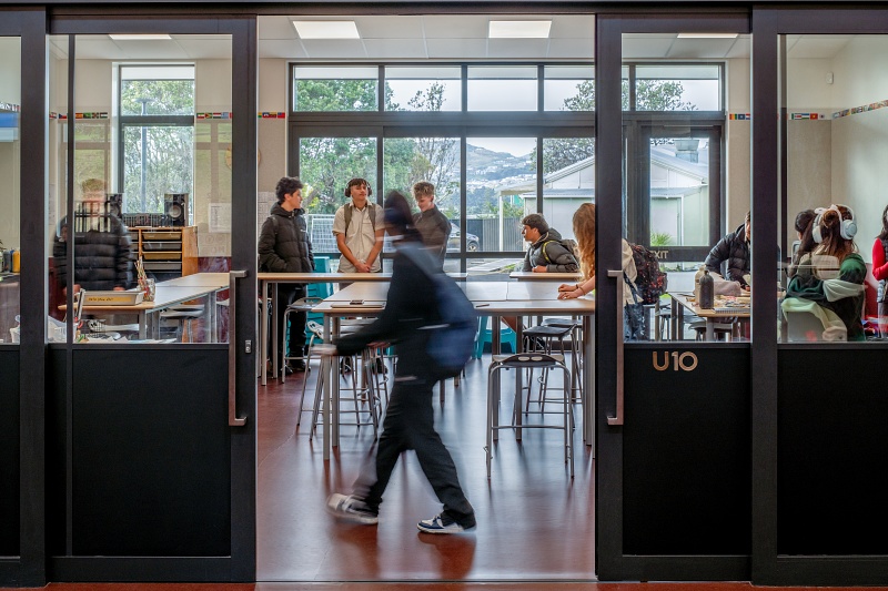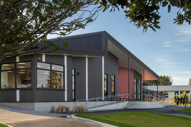 With the old blocks safely cleared away, we returned a few months later to build a new single-storey block with 14 specialist technology and science teaching spaces (Te Urukahika) and a special needs wing (Te Whare Ako). The building has a ring beam and pad foundation with a rib-raft heated slab, a structural steel frame and a prefabricated warm wall and warm roof envelope.