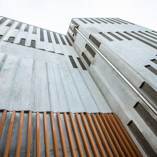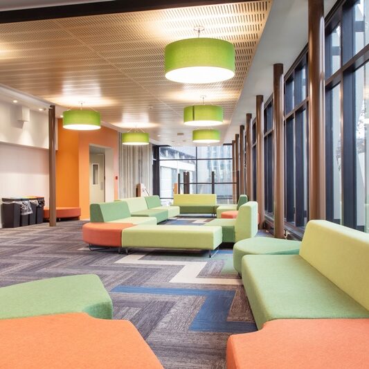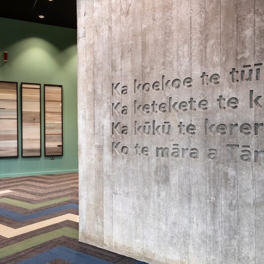 Prominent design features include a floating concrete floor to eliminate vibration, three layers of GIB Noiseline, and over 900 acoustic boxes featuring multiple different compositions and a variety of colours.