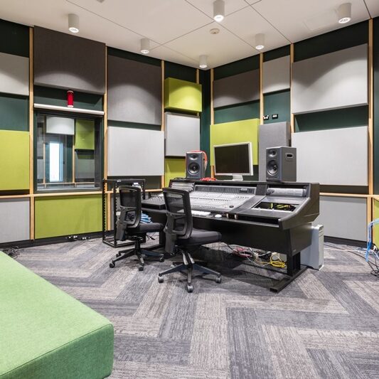 The Recording Studio is the School of Performing Art’s star attraction. It houses a live studio with enough space for a full orchestra, three control rooms, two percussion rooms, four practice booths and social spaces.