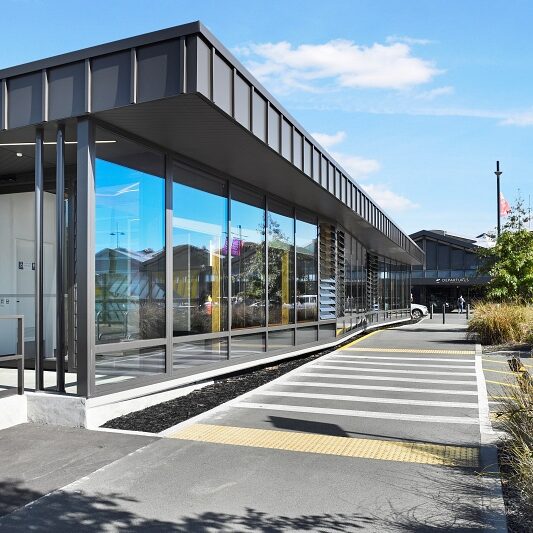 Prominently located in front of the terminal building, the rental car hub is constructed with a concrete foundation, LVL timber structure, Kingspan roofing and metal cladding. The design and materials complement the award-winning main terminal, with our team endeavouring to deliver the same top-quality finishes inside and out despite the rental car hub’s much smaller scale.