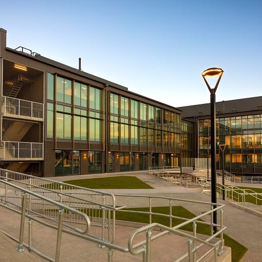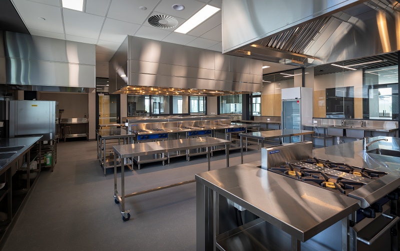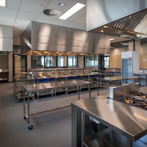 Naylor Love delivered the new technology block at Northcote College, Te Toka Tū Moana. The building comprises 37 specialist teaching spaces – notably including four commercial-grade kitchens and a restaurant – plus a library and learning support centre across two three- and four-storey wings linked by a full-height glazed central atrium. External works included landscaping, pedestrian connections, car parking and campus-wide infrastructure upgrades to drainage, power and communications.