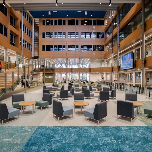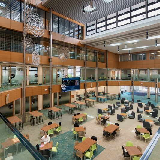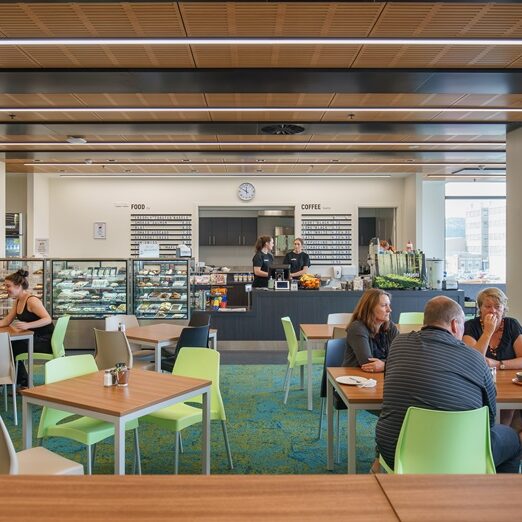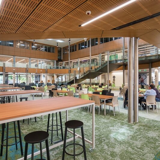 The project involved reconfiguring the three lower floors to be more welcoming, useable and easier to navigate. We added new stairways, entrances, windows, a café, offices, meeting rooms, teaching spaces, a computer lab and lounges – a total of 6,072m2 reshaped and refurbished along the lines of a Modern Learning Environment.