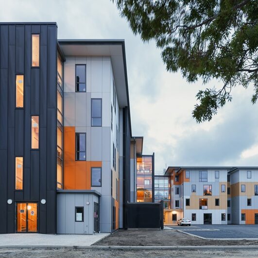 Te Pā Tauira – Otago Polytechnic Student Village has 231 beds in two wings of student accommodation, with single and single ensuite bedrooms in the five-storey west wing and a mixture of studios and four-bedroom apartments in the four-storey east wing, along with open-plan communal spaces.