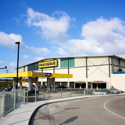 Pak’nSave Westgate in Massey North, Auckland, is a new 6,000m² supermarket, built over 8,000m² of new basement car parking, along with a petrol station and retaining walls on a challenging sloping site.
