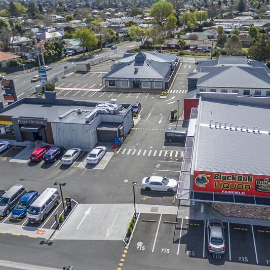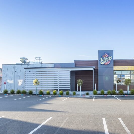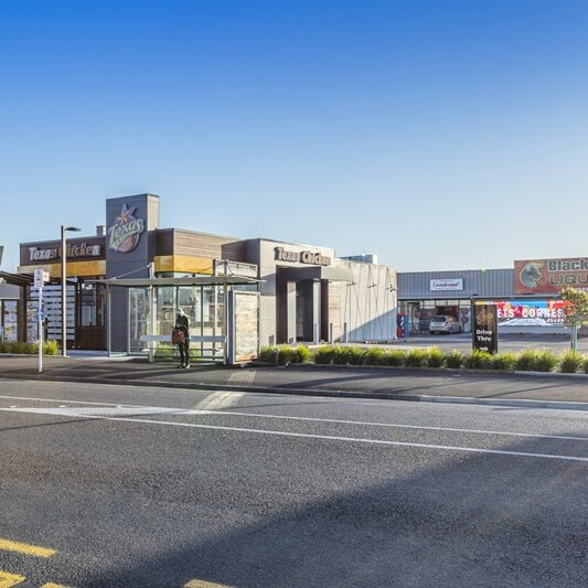 The two buildings in the second stage are a 288m² Texas Chicken restaurant and a separate 392m² building with three retail tenancies. Both are single-storey, steel portal and precast panel structures with a mixture of Espan metal cladding, recycled bricks and timber weatherboards. High performance insulated roof panels were used over the restaurant, with a more traditional Colorsteel commercial roof on the retail complex.