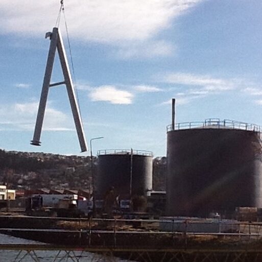 We used a 400t crawler crane to place temporary sheet piling into the seabed, forming the cofferdams that allowed us to the pour concrete foundations to anchor the huge prefabricated metal dolphins, which were also craned in. Quality control was critical, as the engineer needed to be confident the new dolphins could handle the forces of heavily laden tankers pushing against them while berthing and in high winds.