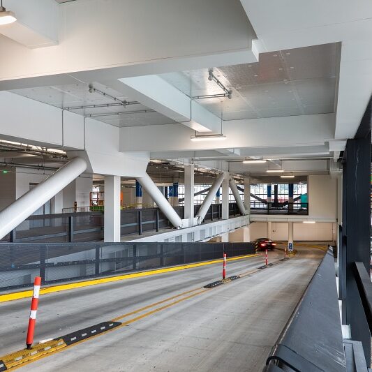 The car park building has a deep raft foundation requiring concrete pours of up to 1,000m3 at a time. A great deal of detailed planning and coordination was required to ensure there were enough trucks available for these pours.