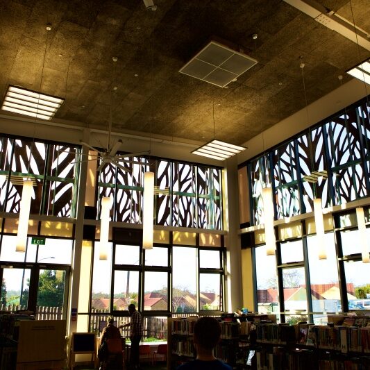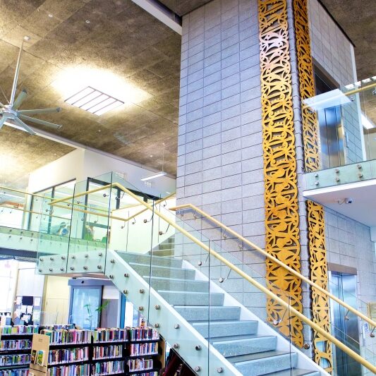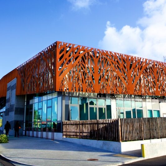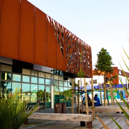 Ranui Library is a light and open 800m² two-storey building, which features a distinctive tree-patterned galvanized steel structure enveloping the exterior.