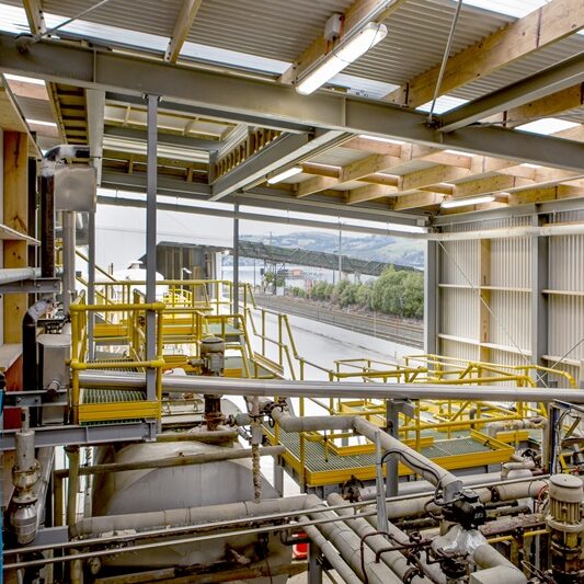 Works included a new steel portal-frame structure erected in the middle of Ravensdown’s plant and coordinated around their operations, re-levelling the existing concrete floor with a topping slab, insulating pipework and modifying it to suit the new building layout, building a new motor control centre room for the plant’s electrical equipment, and installing new high-level walkways to provide safe working access for the maintenance team.