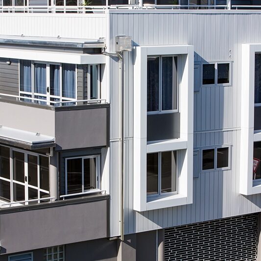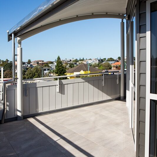 The building features wraparound decks on three elevations with Juliet balconies cantilevering outside the building line on the southern elevation. The decks posed a significant challenge in terms of achieving compliant falls and acoustic performance, coupled with cladding clearances and threshold restrictions.
