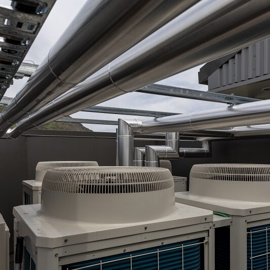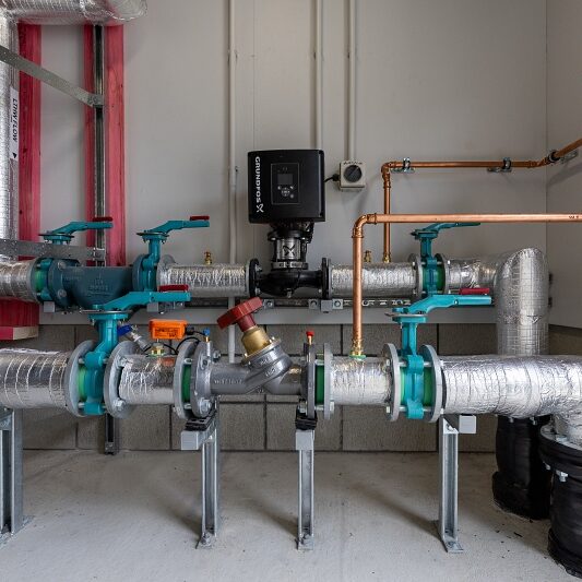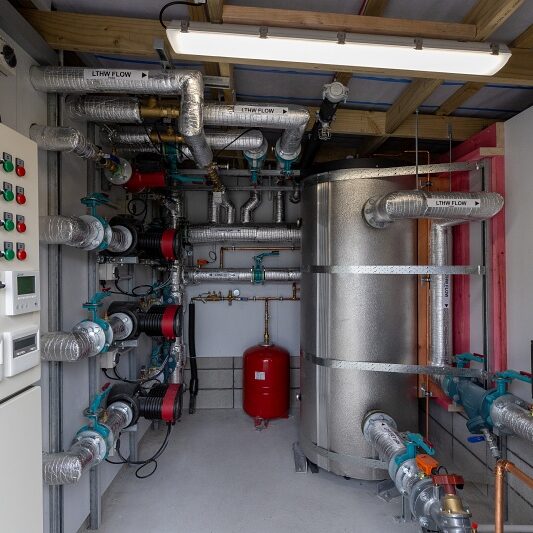 We completed heating upgrades at Shotover Primary School, replacing the fossil fuel boiler with an efficient hot water heat pump system. This involved building two sheds to house the electrical plant and excavating a 200-metre trench for the insulated flow and return pipes that run between the plant rooms, classroom blocks and administration block.