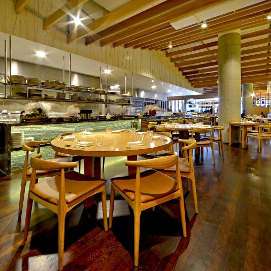 After the existing Lobby Bar and part of the Convention Centre entrance were demolished and stripped out, a structural steel frame was installed for the suspension of the ceiling and services, and the fitout began in earnest. The new restaurant features a majestic curved dining room with low slung ceilings and an open charcoal robata grill, a bar, private dining room and open plan kitchen.