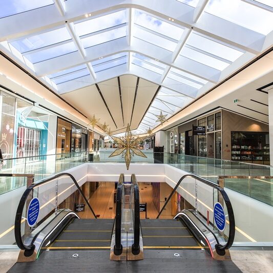Once the structure, cladding and skylights we complete, we started opening the voids and installing the escalators and lifts. Works were again completed at night, with a combination of protective hoarding and flameproof scrim used to cover the voids for daytime operation.