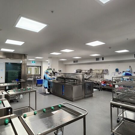 The busy unit is essential to the hospital’s operating theatres and could not shut down. We completed most of the work overnight, installing temporary hoardings and taking great care to ensure that the entire area was dust-free and ready for use in the morning. We followed stringent infection control procedures, including wearing full hospital PPE in addition to construction safety gear when working in the clean rooms.