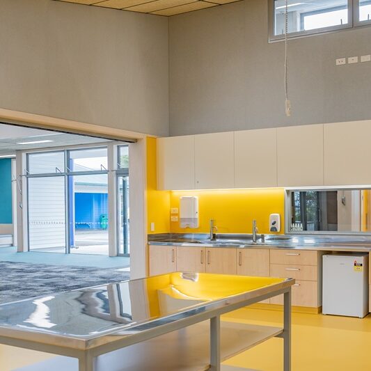 Block M is a single-storey timber framed building, clad with Titan and weatherboard, and enclosed by a Rooflogic warm roof. The new block provides six breakout rooms, two flexible working spaces, four toilets and a kitchen area.