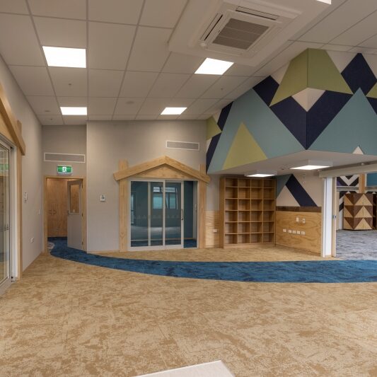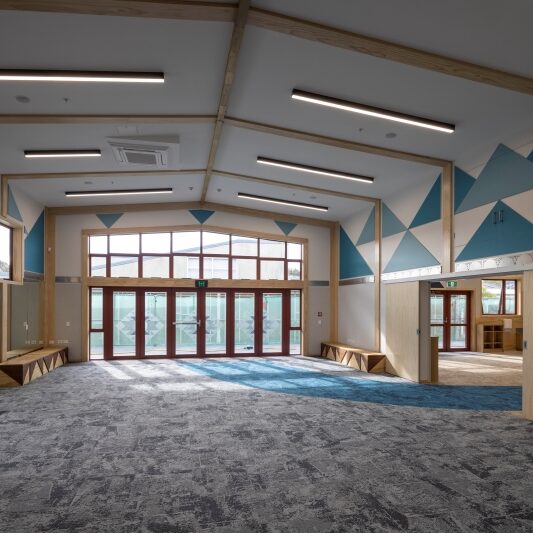 We enjoyed working with our subcontractors, the design team, the Ministry of Education and the school community to complete this project, which incorporated kura’s whakapapa in every element of the design. As a reference to Otago Harbour’s guardian taniwha, Matamata, there is a continuous pathway that winds its way right through the school, expressed in the exposed aggregate concrete paving, vinyl and carpet. The structural steel angled posts protruding through the roof represent ancestor Rākaihautū’s kō (digging stick), which he is said to have used to dig out the lakes and rivers of the South Island. The shade sails depict waka, and we formed intricate kōwhaiwhai patterns throughout the building in Autex Cube acoustic panel, laser-cut aluminium dado rail, window manifestations and plywood decals.