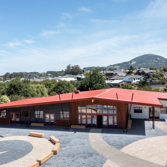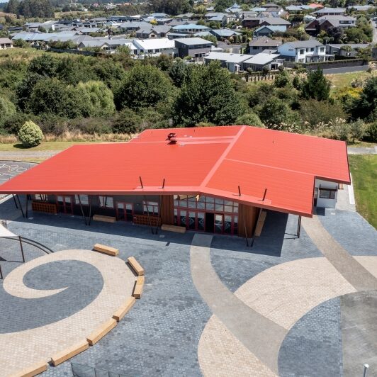 We completed the rebuild of Te Kura Kaupapa Māori o Ōtepoti in two stages, the first being the construction of a new mixed-use building with administration, resource and two teaching spaces, wharekai and wharenui. Once we handed over the new building, the second stage involved the demolition of the old school building plus landscaping, including a stage, shade sails and koru patterned paving.