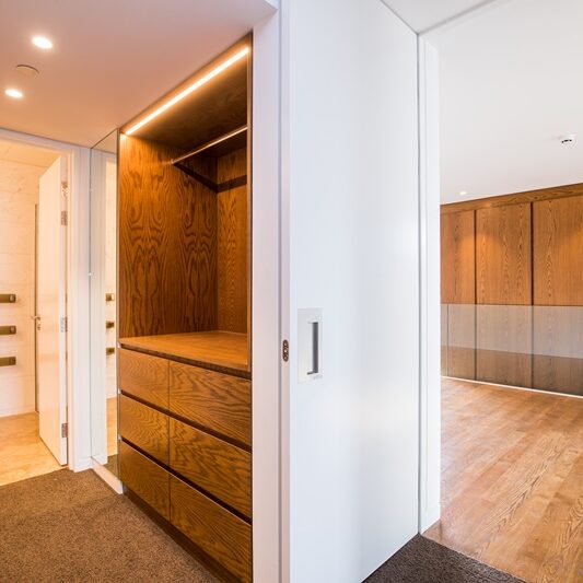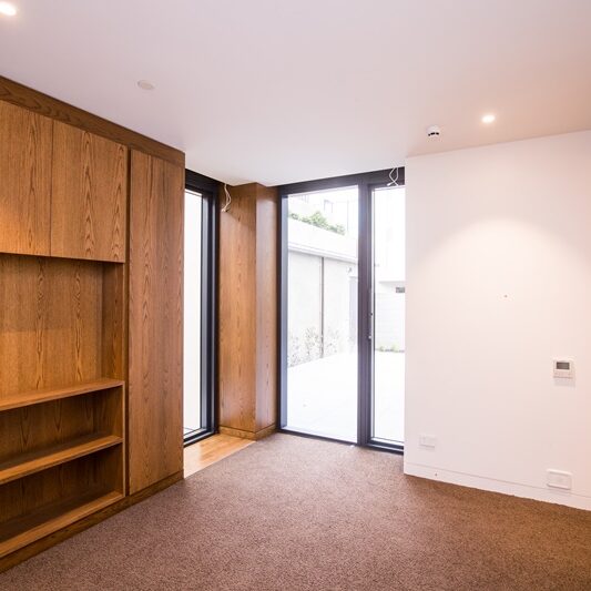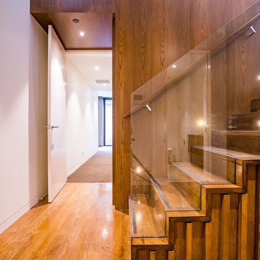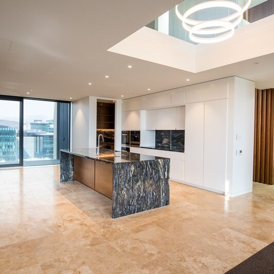 The luxury finishes and fixtures specified dictated that measurements throughout the entire building needed to be millimetre perfect. With standard H1.2 framing susceptible to bowing, we introduced LVL wall partition framing, ensuring that everything stayed straight and true. Our team’s focus on quality ensured that the architect’s vision for the detailing was realised, including the striking neolith façade cladding, pocket doors that seamlessly merge into walls, magnetic door hardware, and the anaconda lighting that that snakes its way up the stairs from the ground floor to level six.