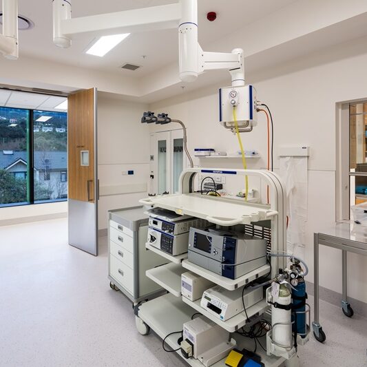 The fitout contains two procedure rooms, a centralised scope cleaning room, pre-admission area, consulting rooms, recovery beds and a discharge lounge. The state-of-the-art medical facilities are balanced with a patient-centred design, with the finishes carefully chosen to provide a welcoming, relaxing atmosphere.