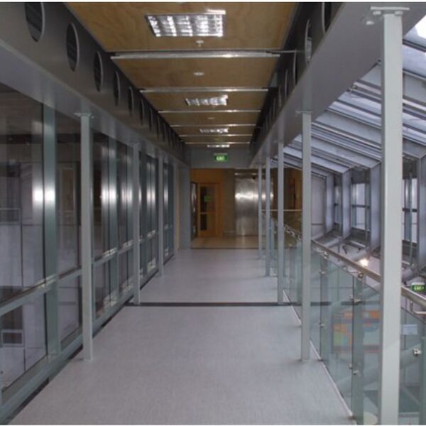 The new three-storey teaching block included a maze of rooms, atriums, corridors, suspended bridges and open courtyards, using a number of materials – the exterior alone had precast panels, zinc cladding, bricks, corrugated iron, curtain walling, and aluminium perforated sheeting.
