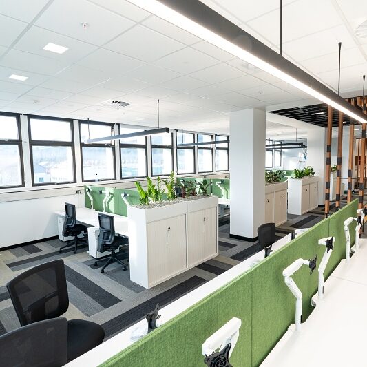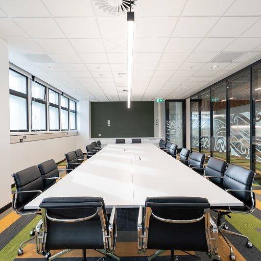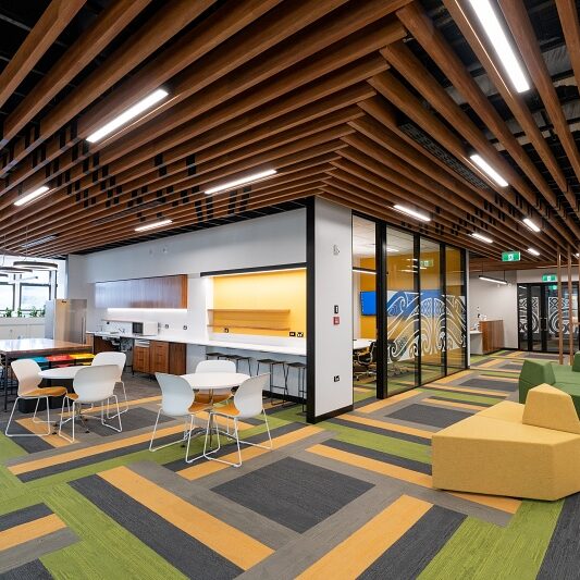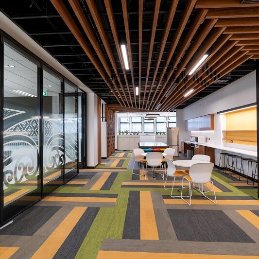 One of the client’s goals was to express a strong cultural narrative in the fitout. Custom window manifestations, artworks and beautifully crafted timber fittings reflect Kāi Tahu raraka mātauraka (traditional weaving knowledge), with ceiling battens formed from fire-rated MDF wrapped in rimu veneer used to make a feature of the exposed ceiling.