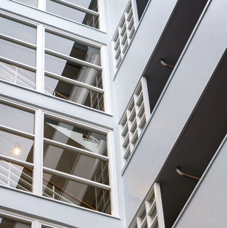 On the second block we relocated the communal laundry from the roof-top to the old furnace room, building a two-storey extension in its place. The extension uses modern materials in a neomodernist style, entirely in keeping with the original building.