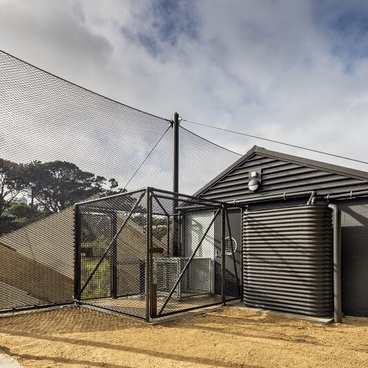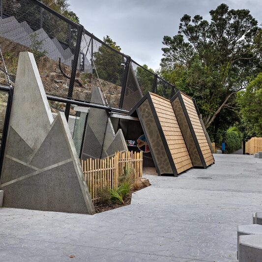 We built a new home for two snow leopards on a steep site at Wellington Zoo. It is designed to mimic their mountainous territory as closely as possible, with extensive retaining works hidden behind natural-looking structures and a strong but transparent steel mesh roof.