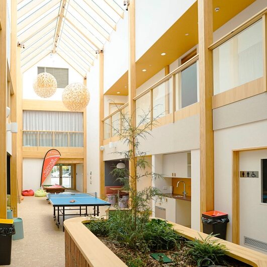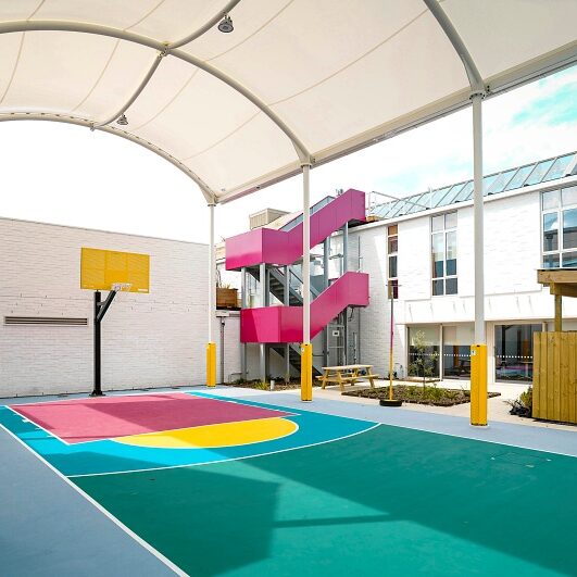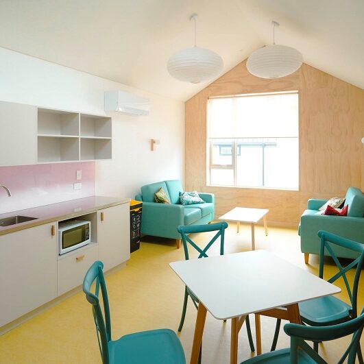 Te Hurihanga Ō Rangatahi – The Youth Hub is a one-stop-shop for youth health, social and support services, with a wraparound services block to accommodate more than a dozen providers and a supported housing wing. A multi-use activities court covered by a steel-framed canopy sits between the two buildings.
